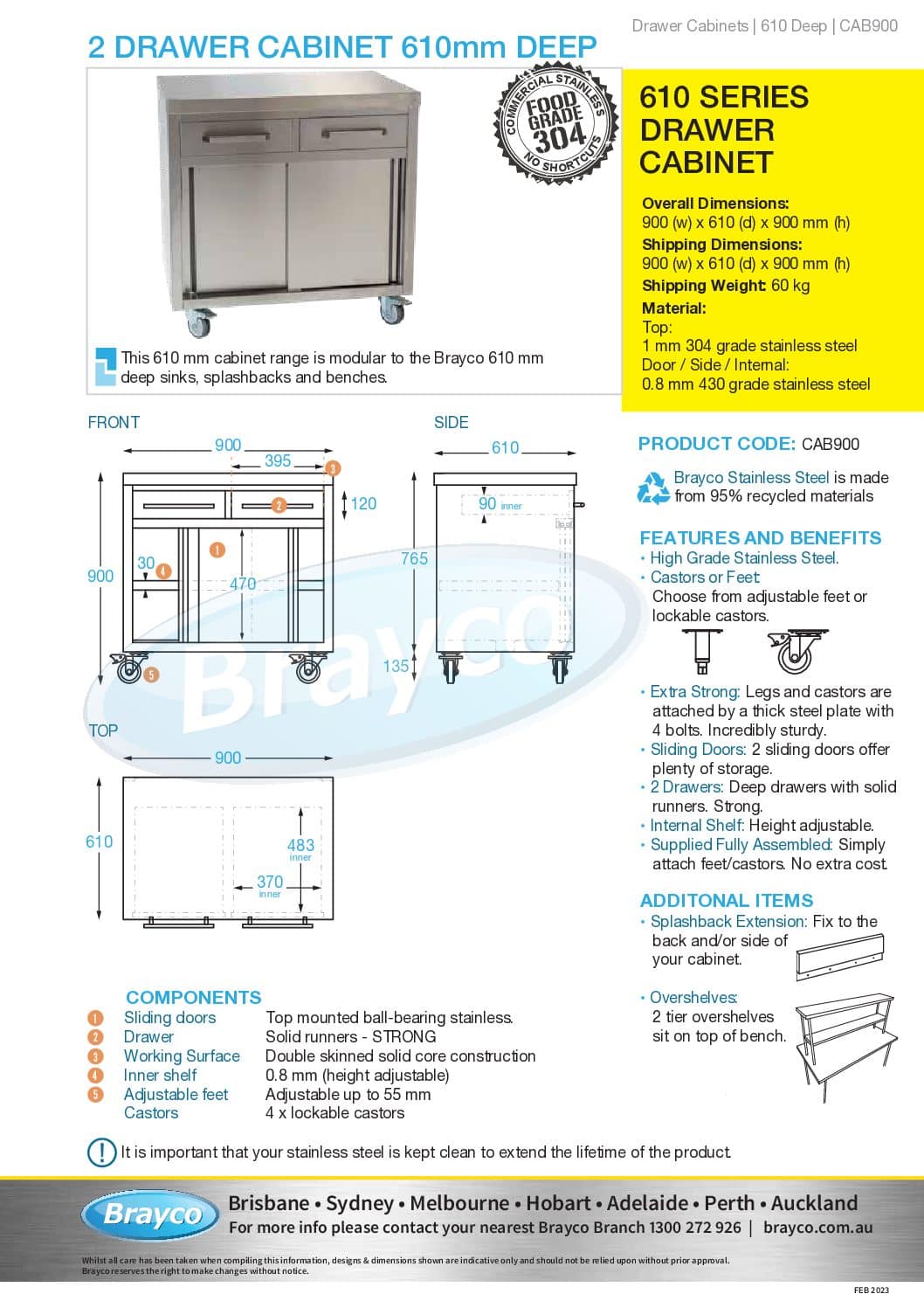 This cabinet is modular to 610mm deep splashback benches, flat benches and sinks.