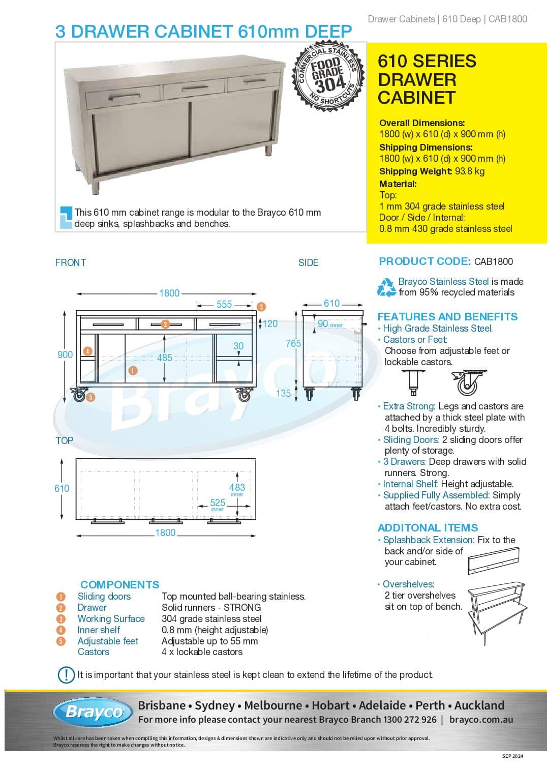 This cabinet is modular to 610mm deep splashback benches, flat benches and sinks.