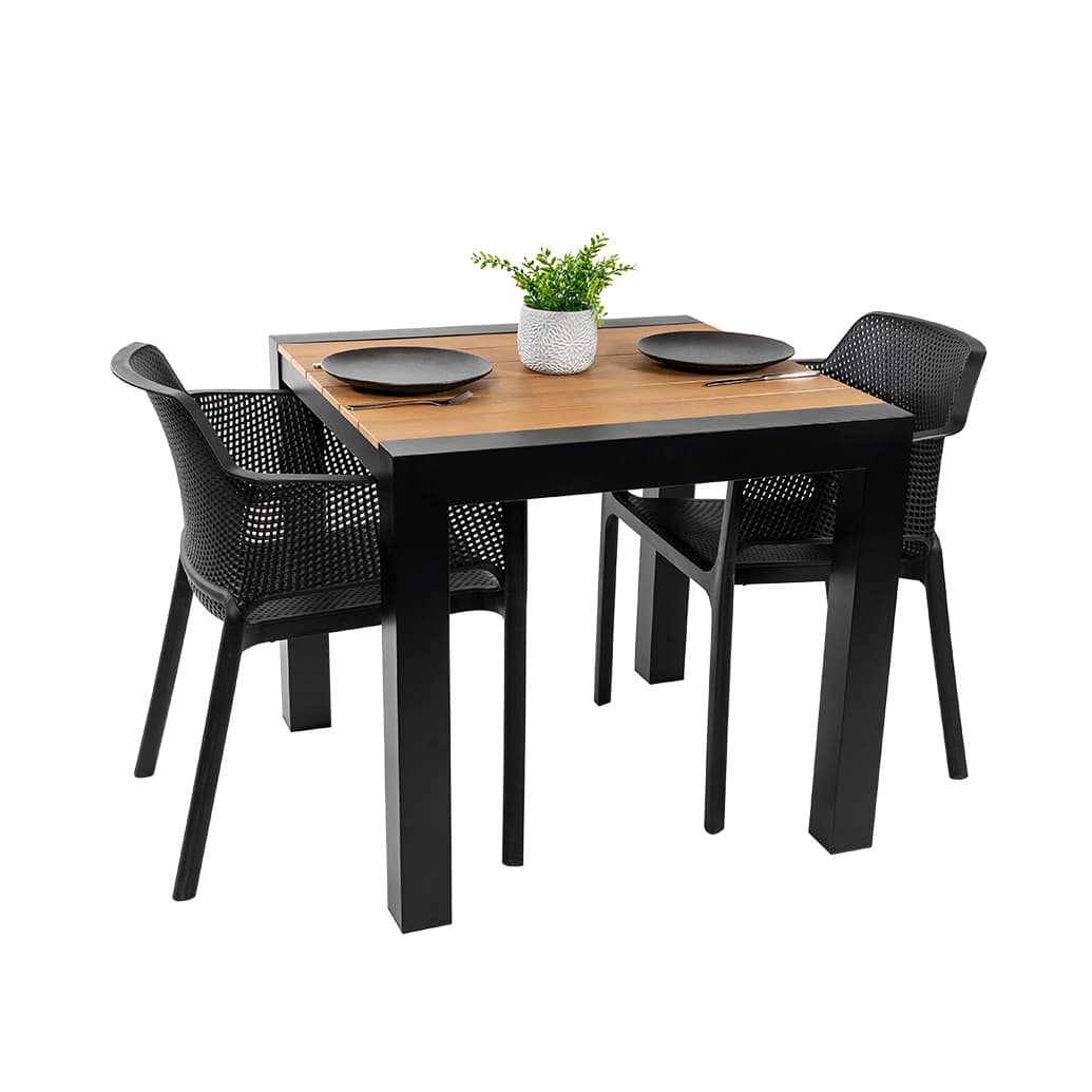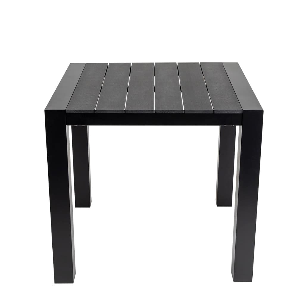 • Polywood table top – all-weather, durable faux timber slats.