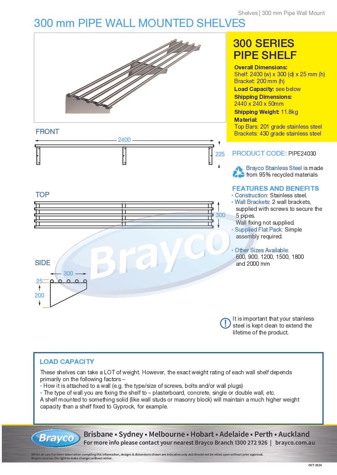Stainless Steel Pipe Wall Shelf, 2400 X 300mm deep