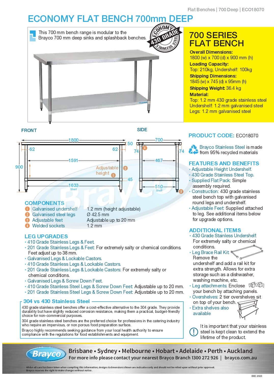 430 grade stainless steel benches offer a cost-effective alternative to the 304 grade. They provide durability but have slightly reduced corrosion resistance, making them a practical, budget-friendly choice for non-commercial purposes. 304 grade stainless steel benches are the preferred choice for professions in the catering industry who require an impervious, or non porous food preparation surface. Brayco highly recommends seeking guidance from your local health authority to ensure compliance with the regulations for food establishments and equipment.