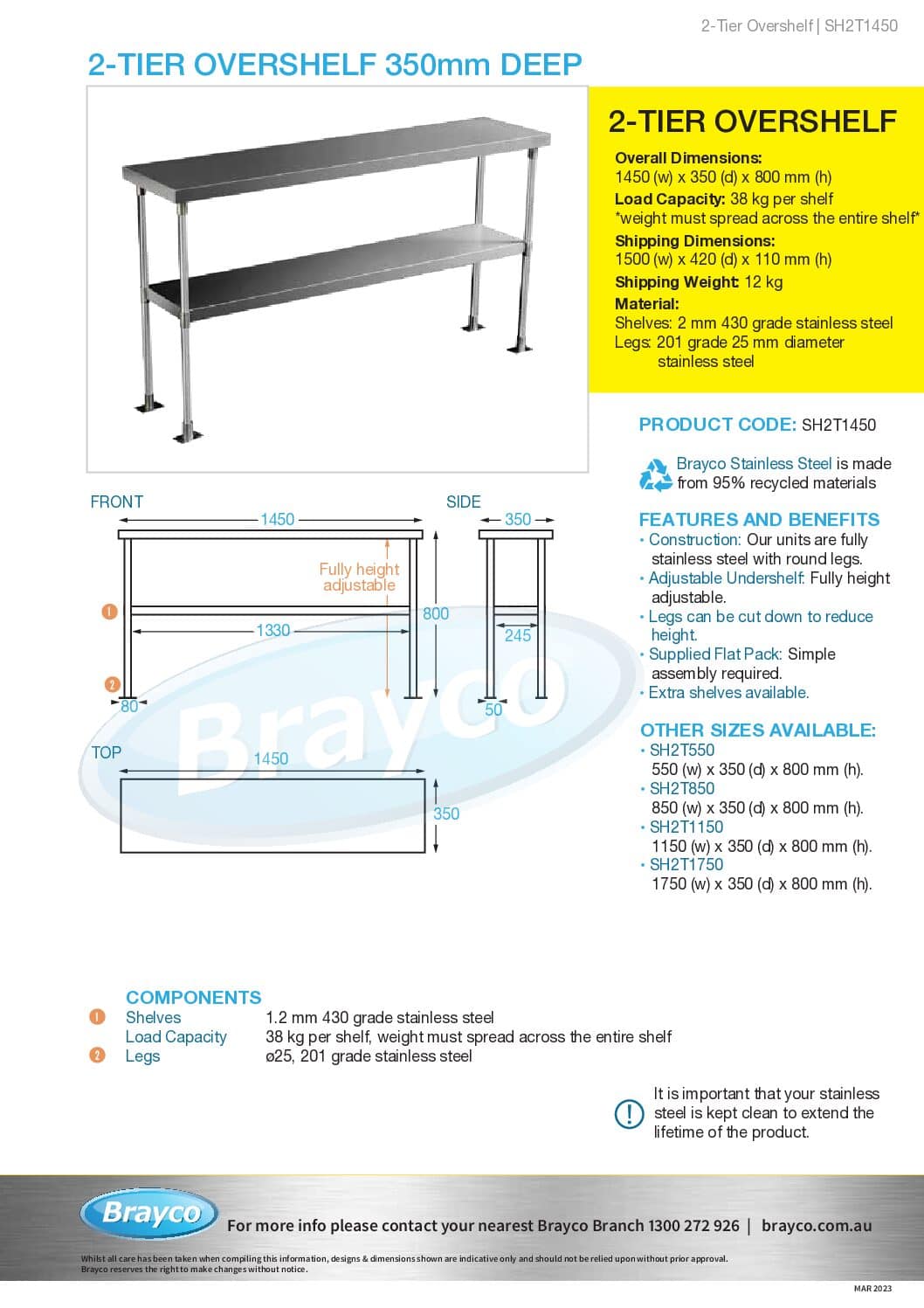 Stainless Steel Over Bench Shelf 2-Tier, 1450 X 350mm