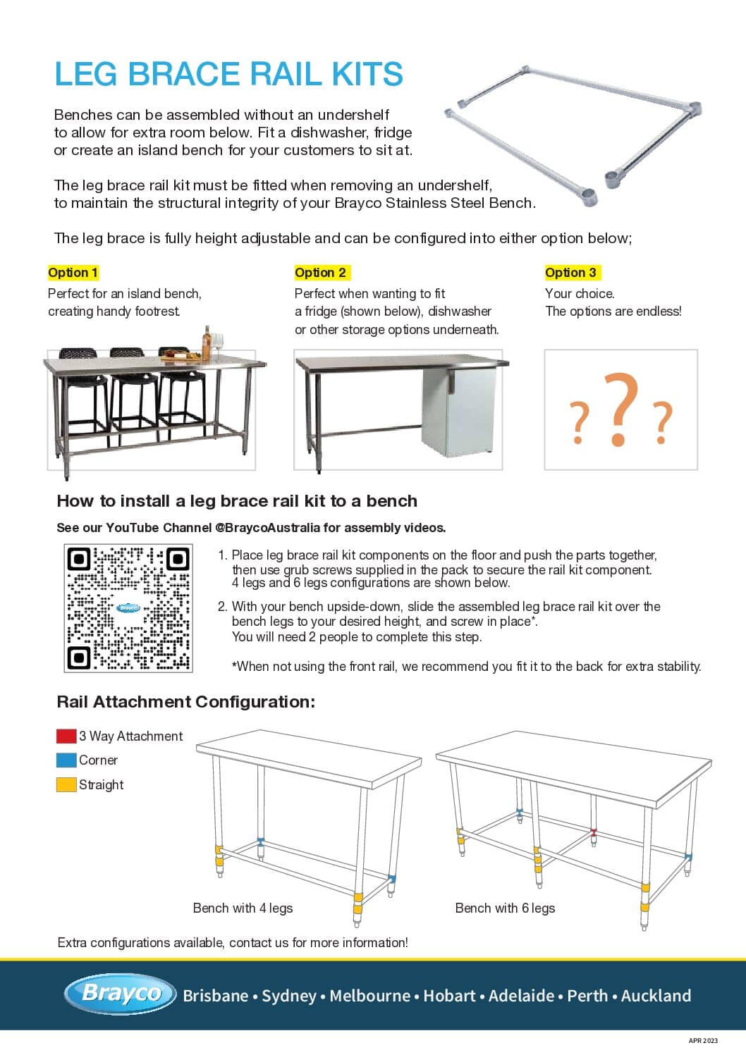 Designed to stabilise and reinforce a bench when removing the undershelf. These stainless rails can be fixed anywhere on the bench legs. Image above shows configuration for parts supplied in this kit. Leg brace rail kits allow extra storage room but provide stability and strength when removing the shelf.