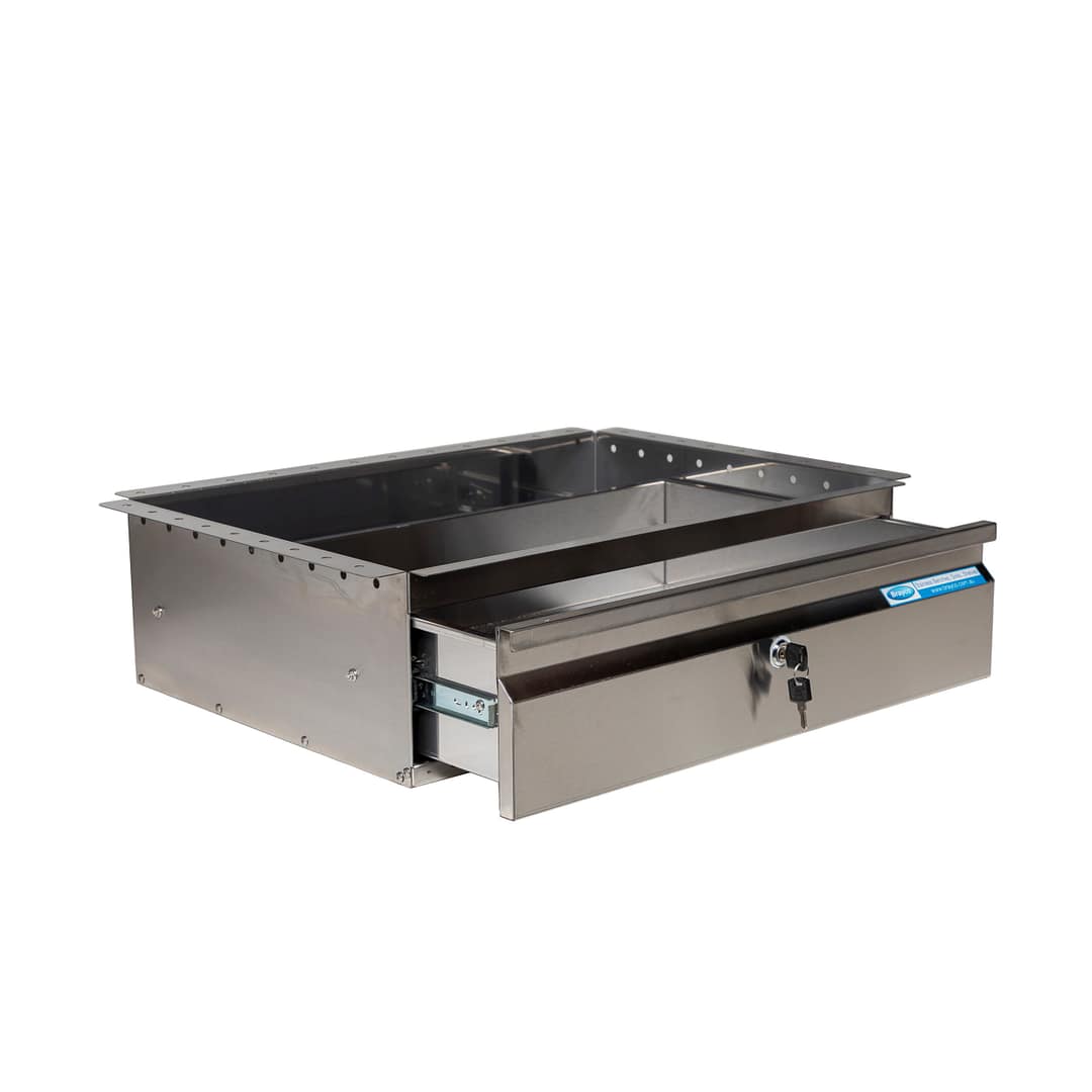 This is our biggest lockable drawer. with 2 drawers – one deep and one shallow, you’ll be able to safely store just about anything. Easily screws to any Brayco bench. Drawers measure 420 x 420 mm internal size.