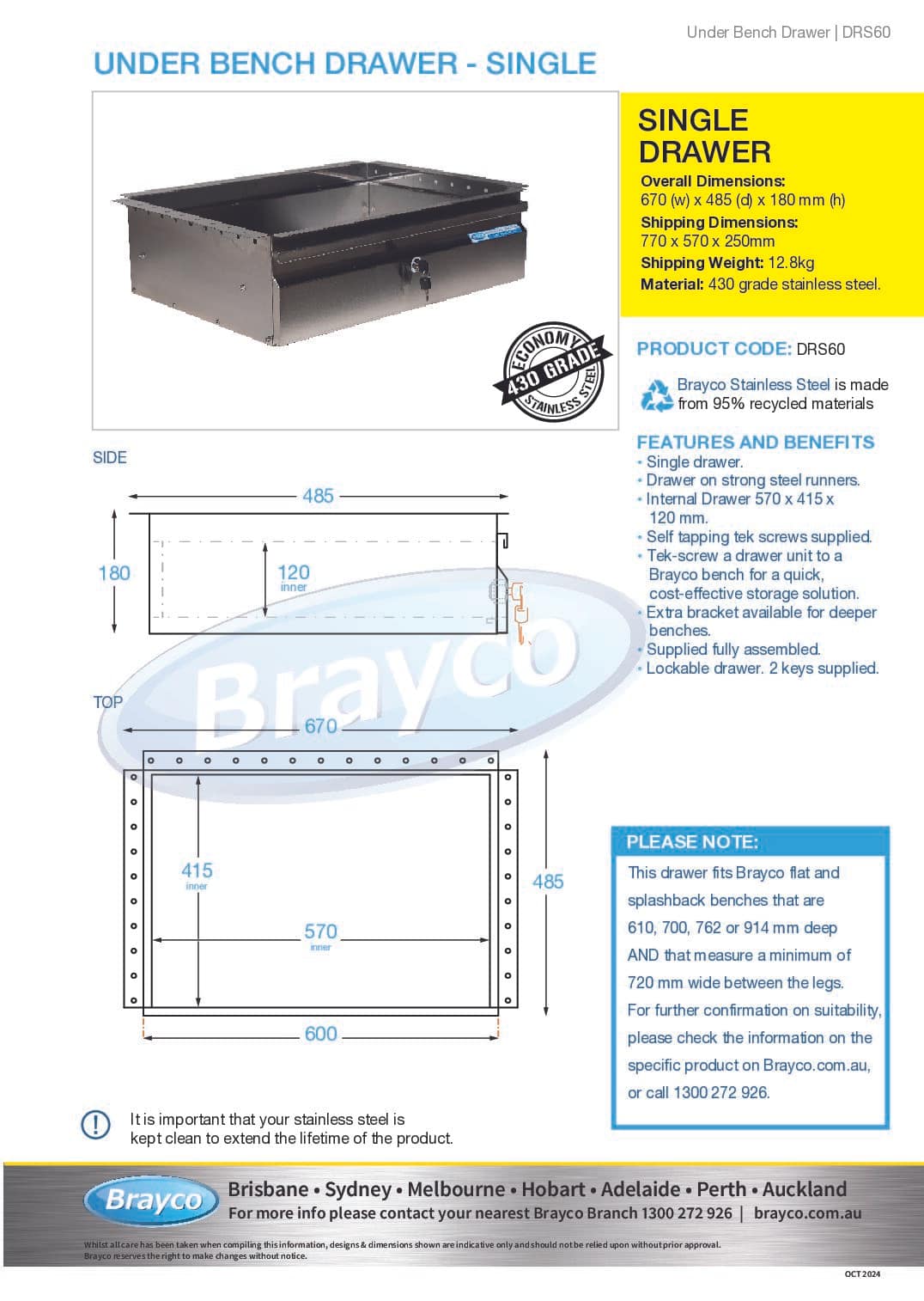 These drawer units are lockable and tek-screw easily under any Brayco benches, with two keys supplied. Supplied fully assembled, because looking after you is how we roll.