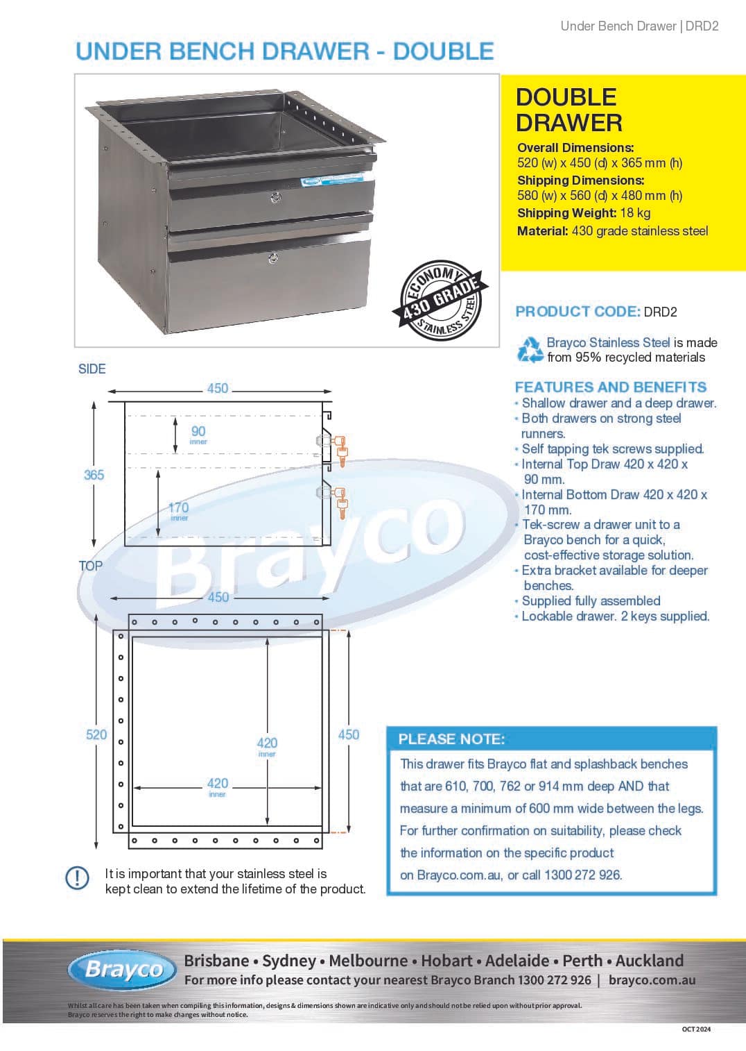 Lockable drawer units are an excellent option to store those small kitchen essentials. These drawers easily Tek screw under any Brayco bench. All drawers are 420mm long and 420mm deep.