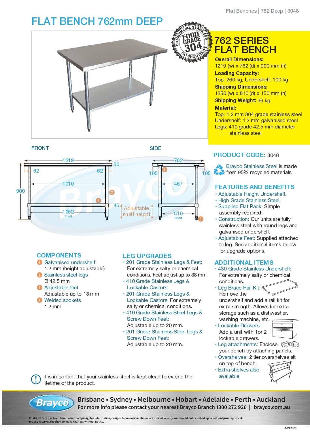 All benches are supplied with a galvanised shelf, stainless legs and height adjustable feet.