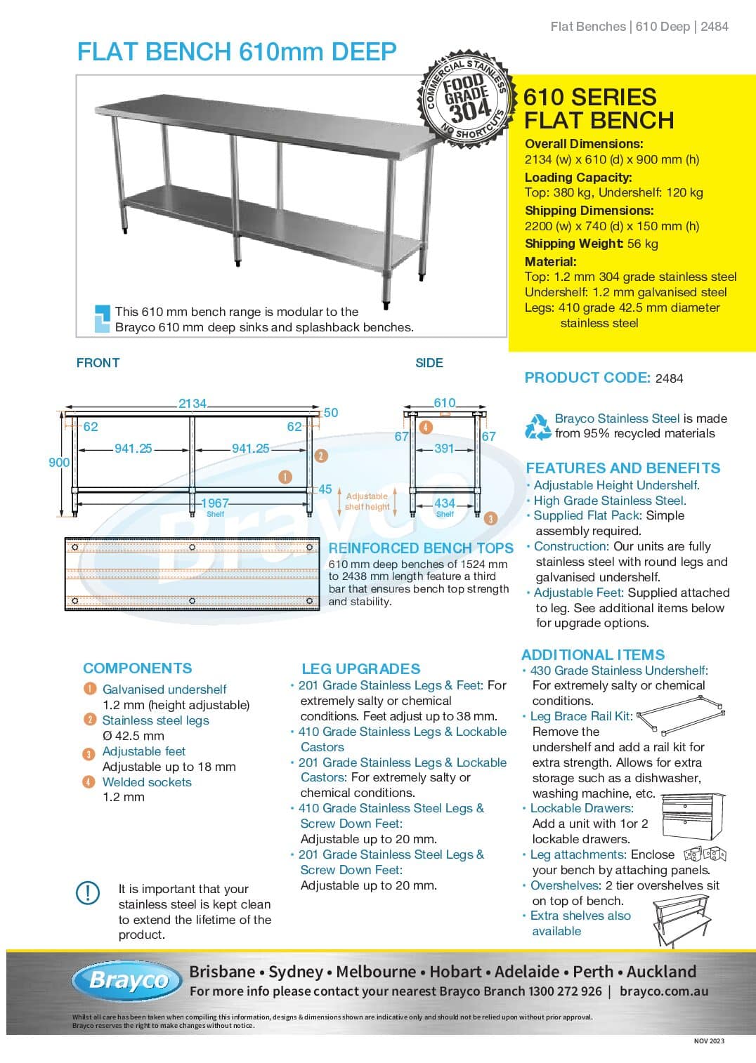 Adjustable feet screw out to give an extra 18mm height – see upgrade options for castors or screw down feet This flat bench is modular to 610mm deep splashback benches and sinks.