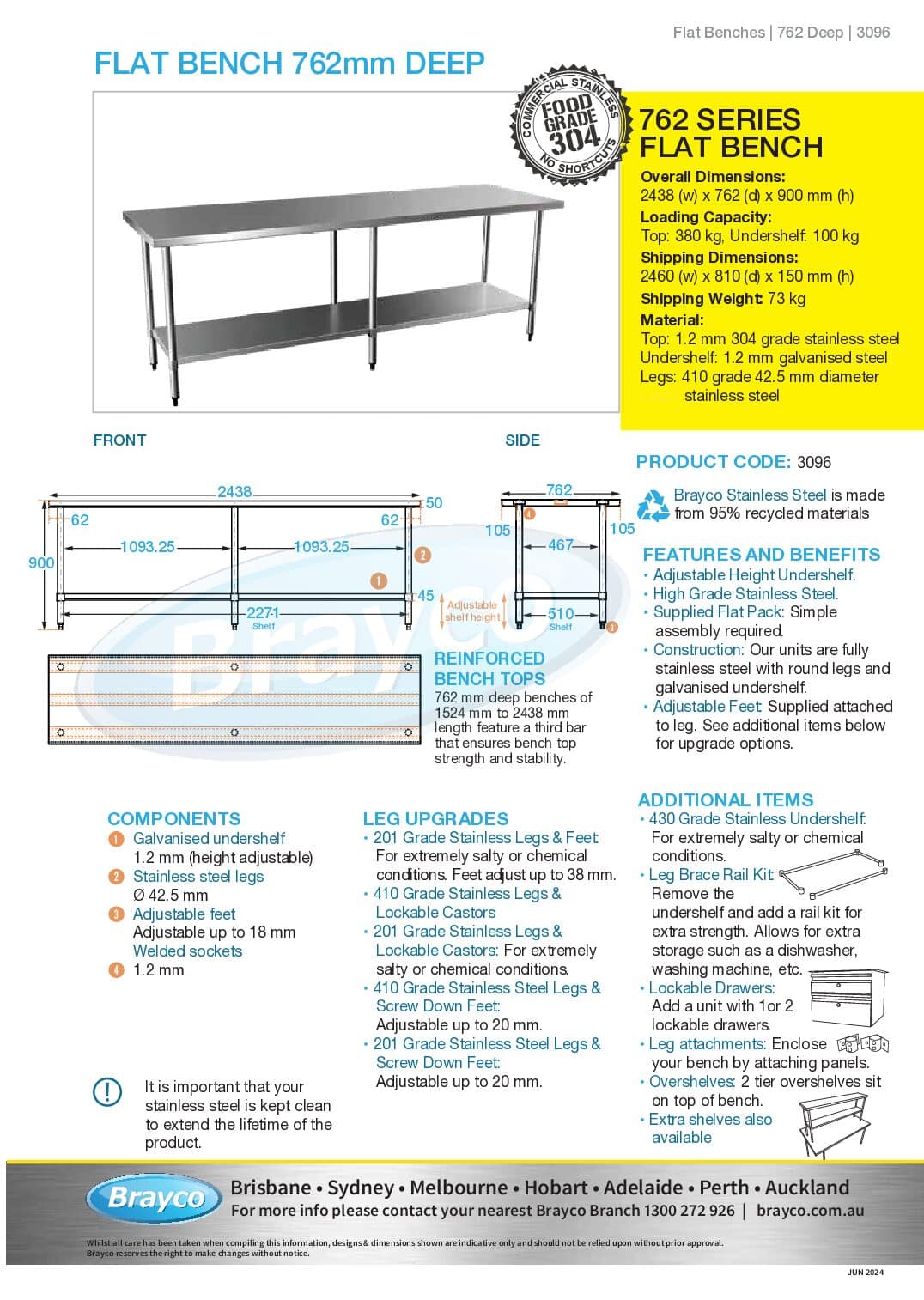 All benches are supplied with a galvanised shelf, stainless legs and height adjustable feet.
