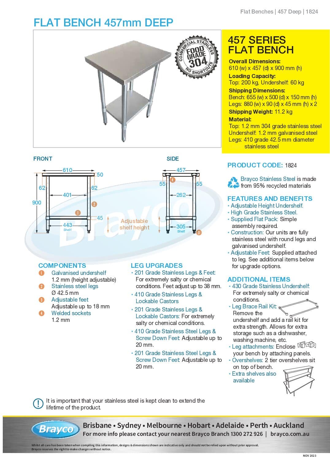 All benches are supplied with a galvanised shelf, stainless legs and height adjustable feet.