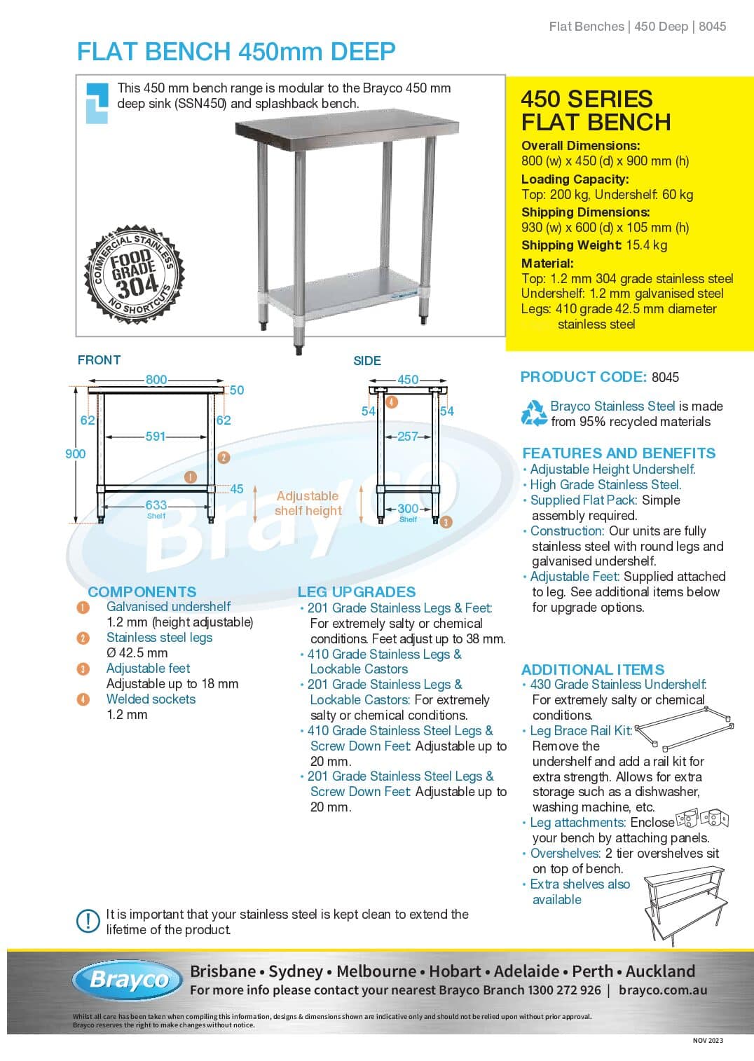 All of our benches come with loads of options for upgrades including stainless steel shelves, high grade stainless steel legs, castor wheels and screw down feet. Dimensions and specs in the tabs below.