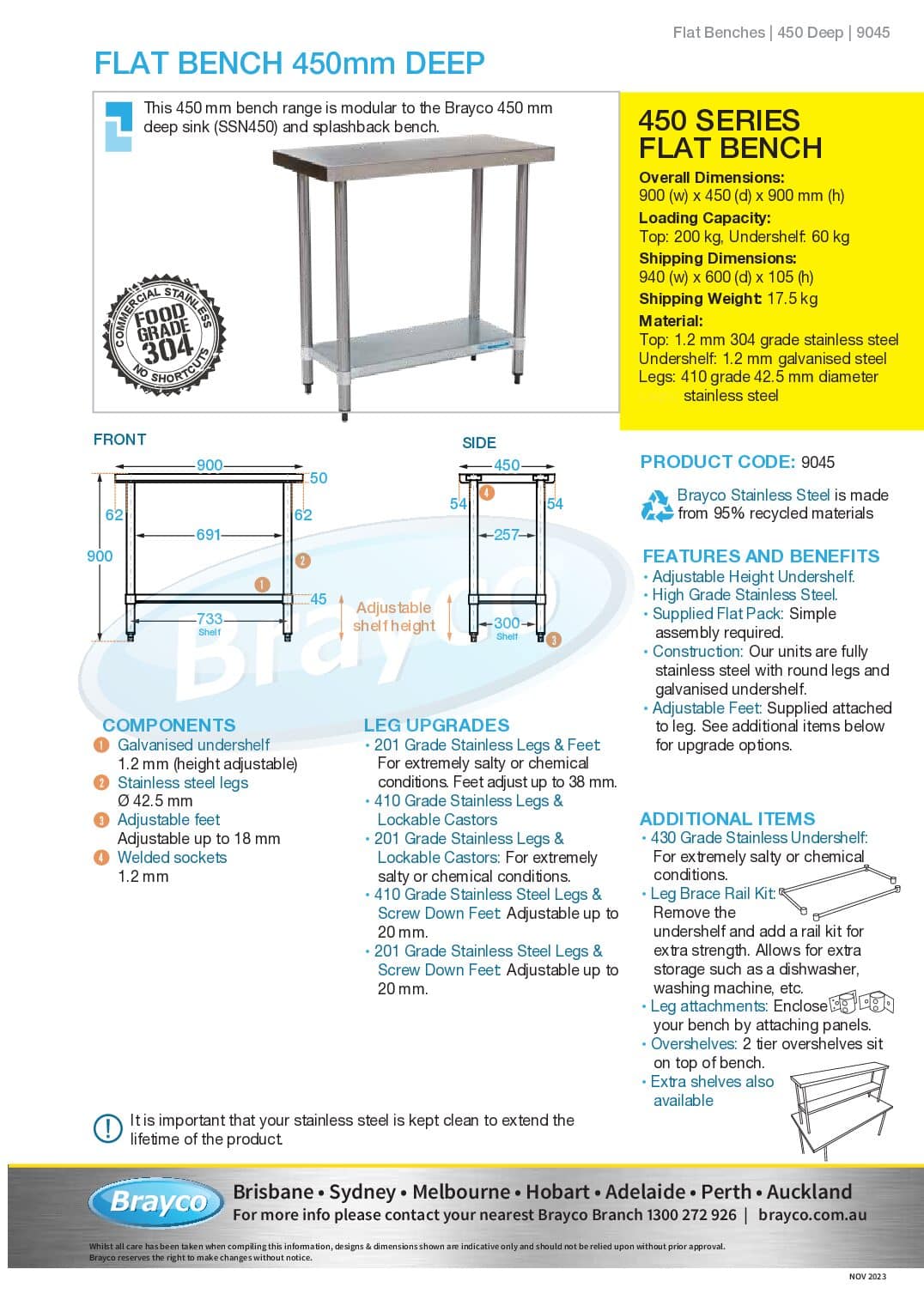 Adjustable feet screw out to give an extra 18mm height – see upgrade options for castors or screw down feet This flat bench is modular to 450mm deep splashback benches and sinks.