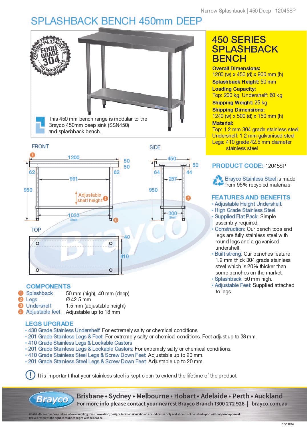Adjustable feet screw out to give an extra 14mm height – see upgrade options for castors or screw down feet This splashback bench is modular to 450mm deep flat benches and sinks.