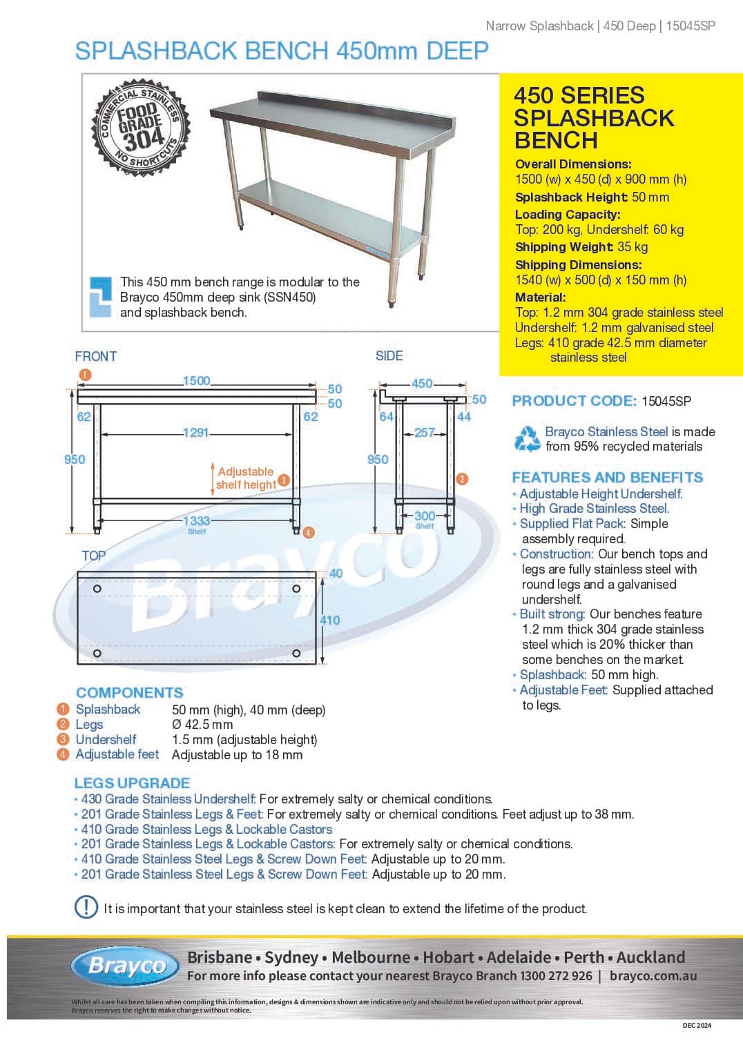 Adjustable feet screw out to give an extra 14mm height – see upgrade options for castors or screw down feet This splashback bench is modular to 450mm deep flat benches and sinks.