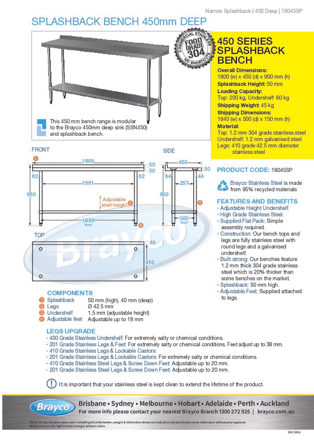 450mm Deep food grade 304 stainless steel bench with splashback and undershelf.