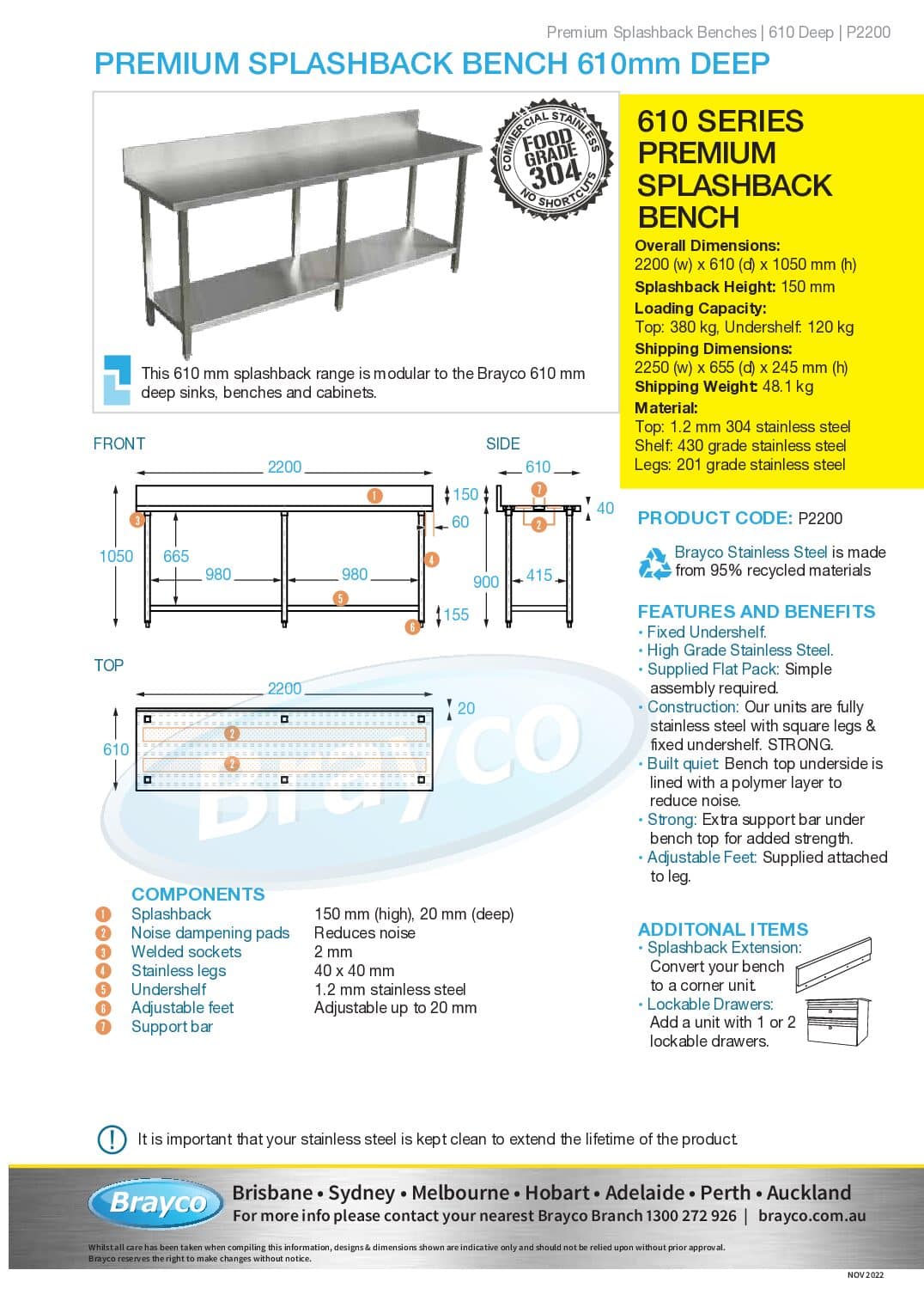 Premium Commercial 304 Grade Stainless Steel Splashback Bench, 2200 X 610 X 900mm high