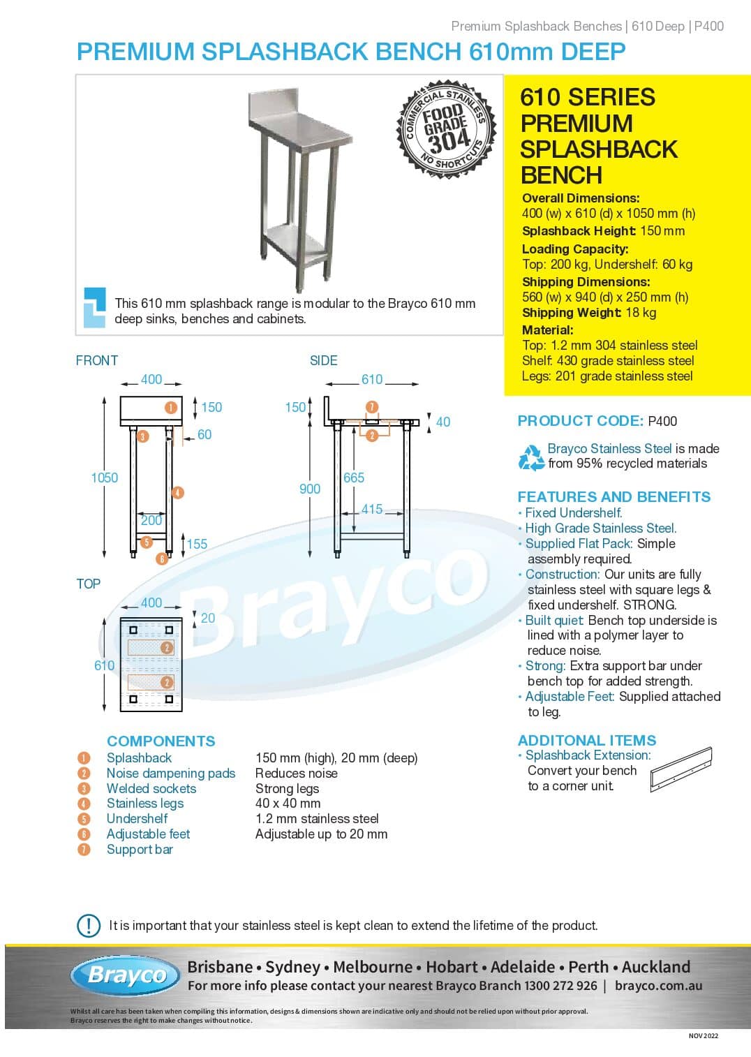 Premium Commercial 304 Grade Stainless Steel Splashback Bench, 400 X 610 X 900mm high