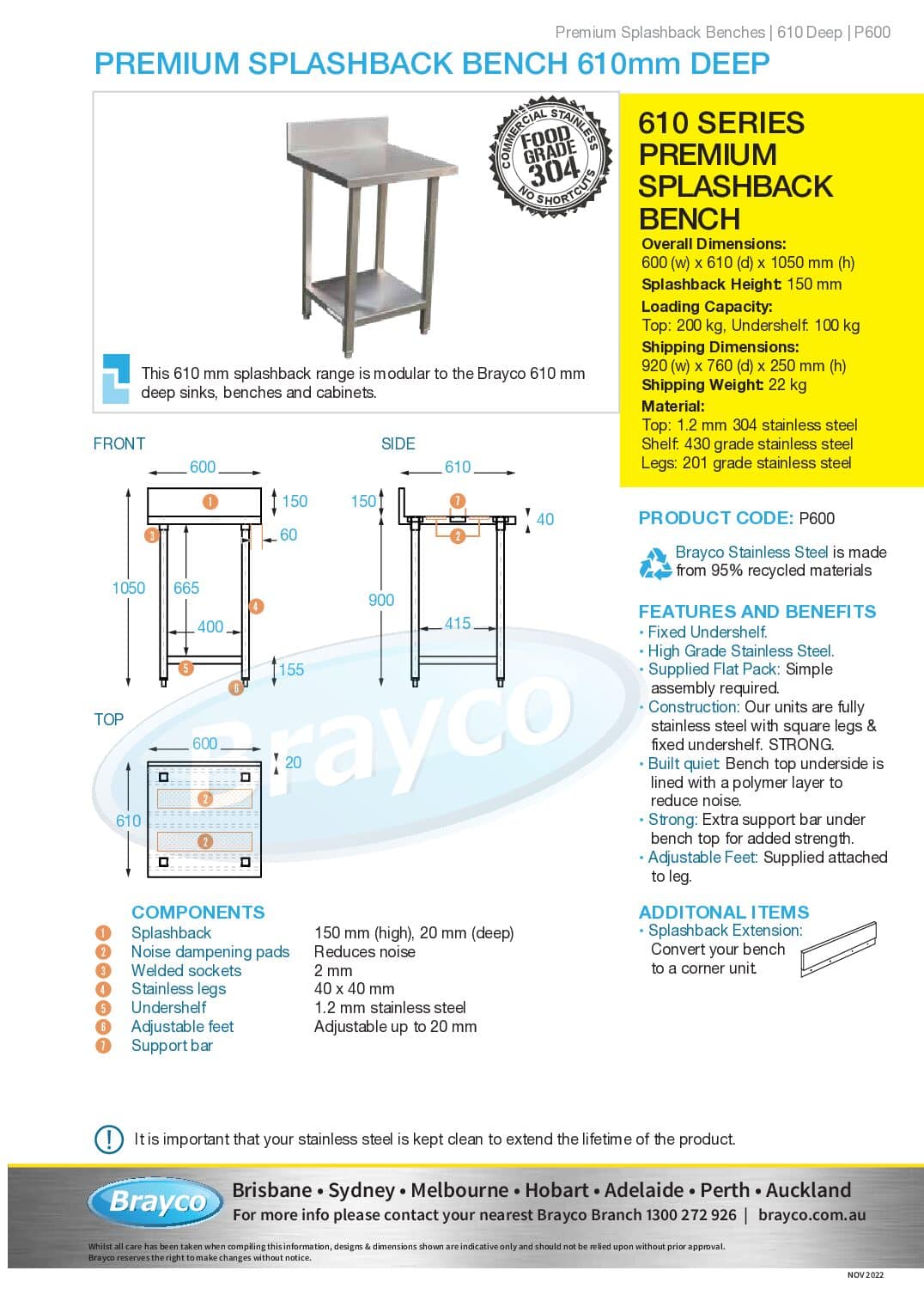 Stainless Steel Premium bench with Splashback, 600 x 610 x 900mm high.