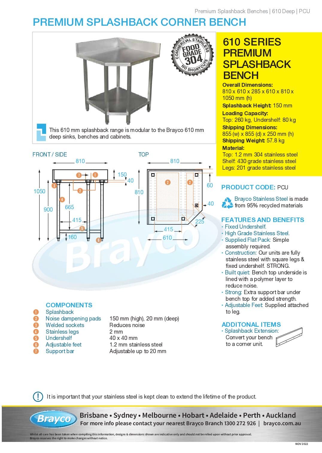 Made with high quality 304 grade stainless, this premium bench is an essential item. Designed to get the most out of your space. It comes with an extra support bar, noise reduction layer, splashback and strong square legs. Dimensions and specs in the tabs below.