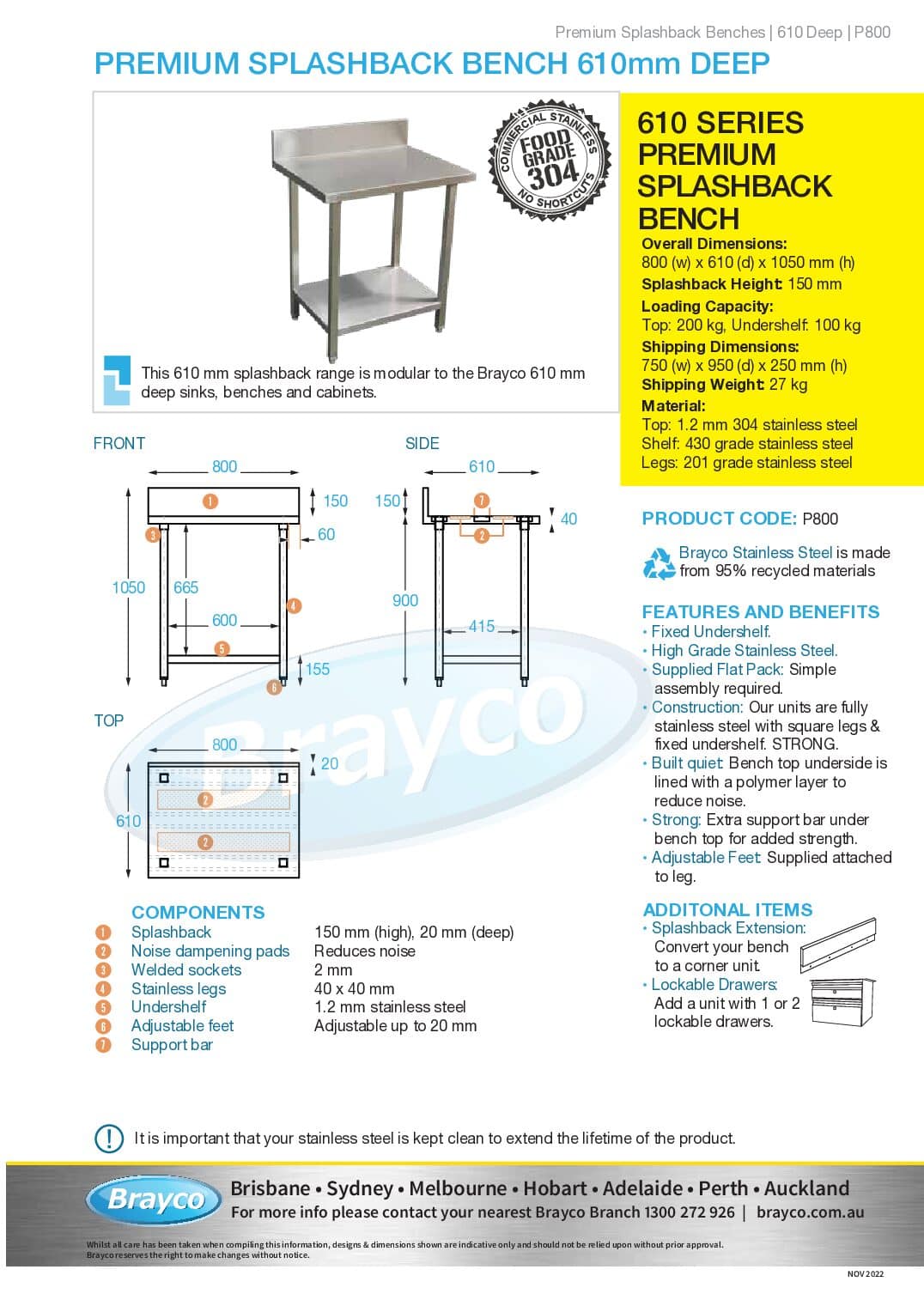 Stainless Steel Premium bench with Splashback, 800 x 610 x 900mm high.