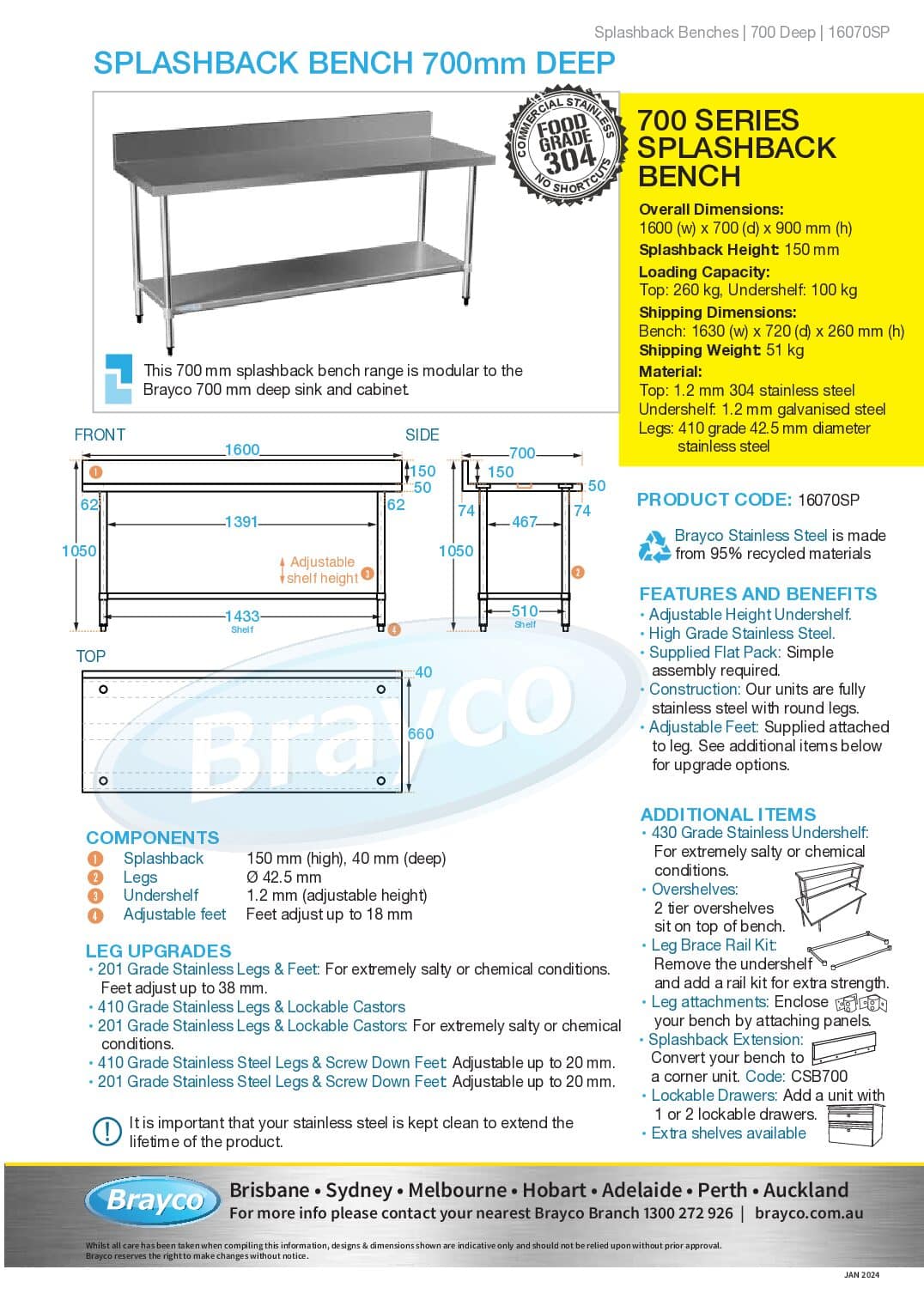 Adjustable feet screw out to give an extra 18mm height – see upgrade options for castors or screw down feet This splashback bench is modular to 700mm deep sinks and cabinets.