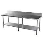 Food grade 304 stainless bench, with splashback, undershelf and adjustable feet.