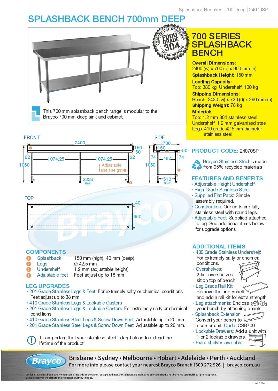 All benches are supplied with a galvanised shelf, stainless legs and height adjustable feet.