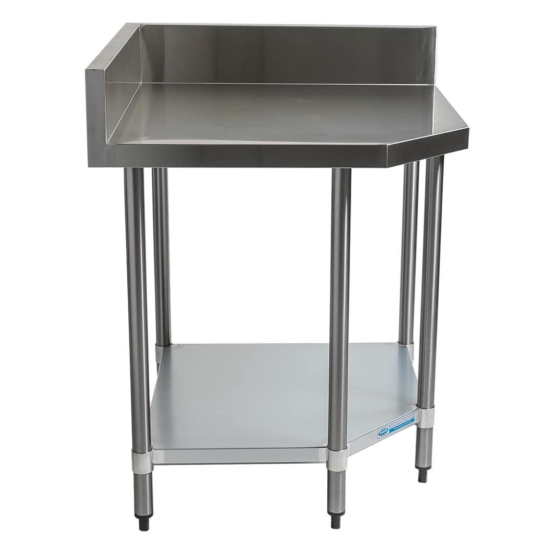 Food grade 304 stainless corner bench, with splashback, undershelf and adjustable feet.