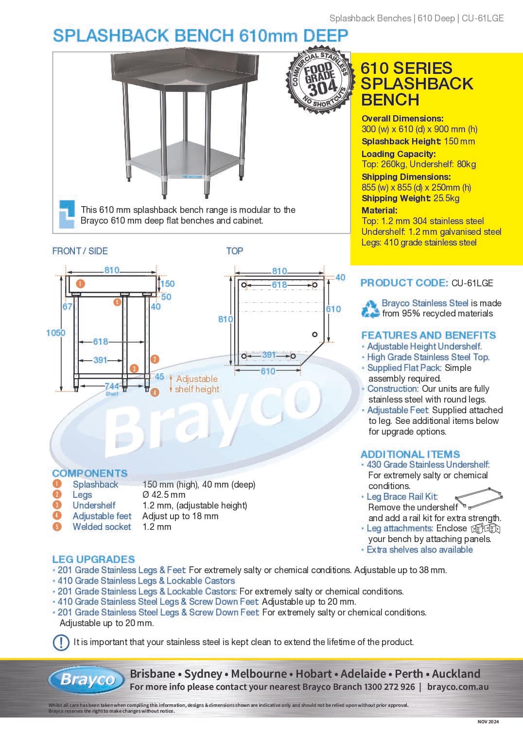 All benches are supplied with a galvanised shelf, stainless legs and height adjustable feet.