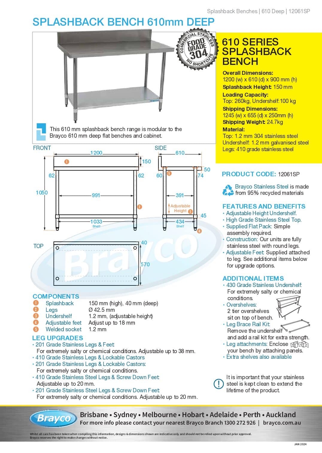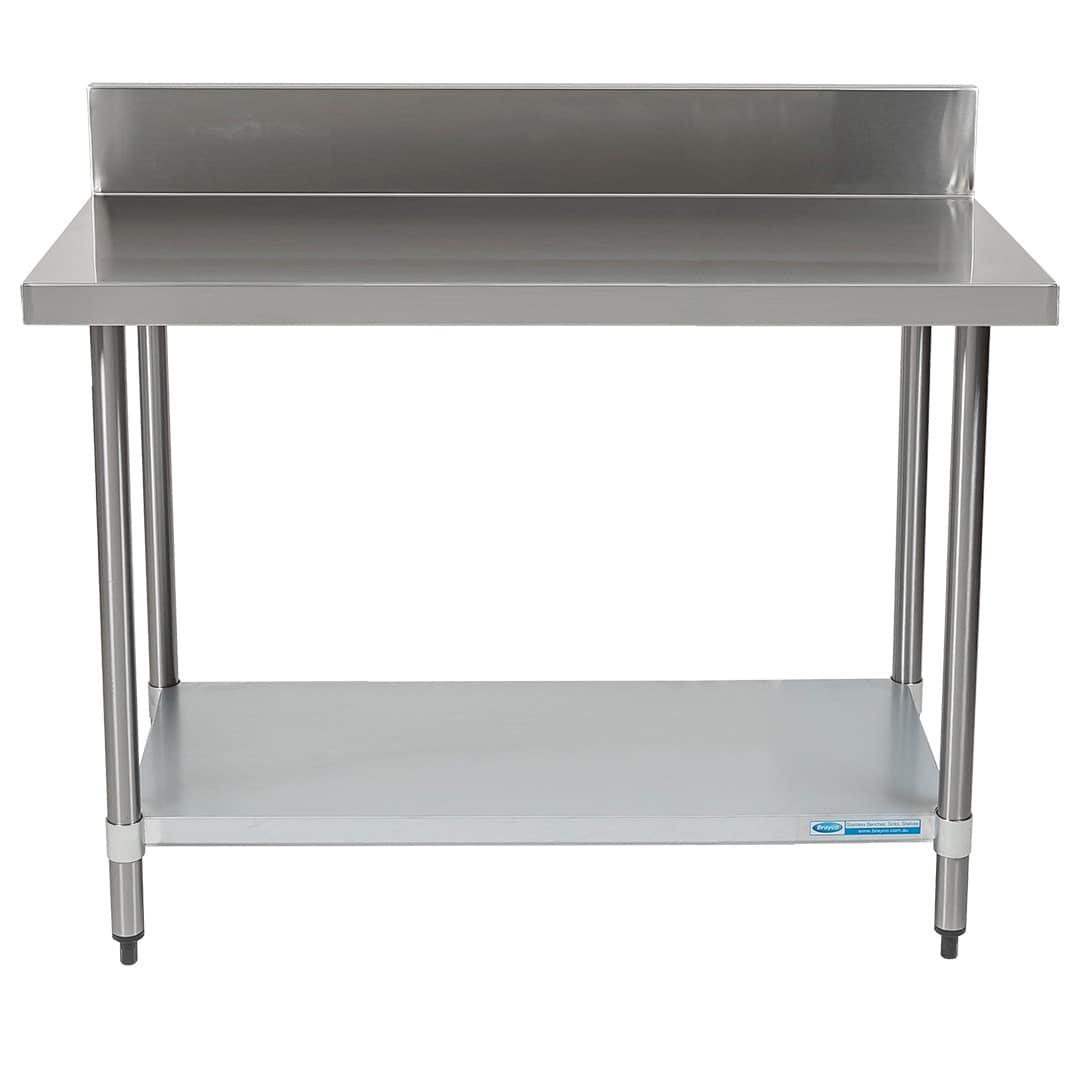 Stainless Steel Splashback Bench, 1200 x 610 x 900mm high. Food grade 304 stainless bench, with splashback, undershelf and adjustable feet.
