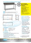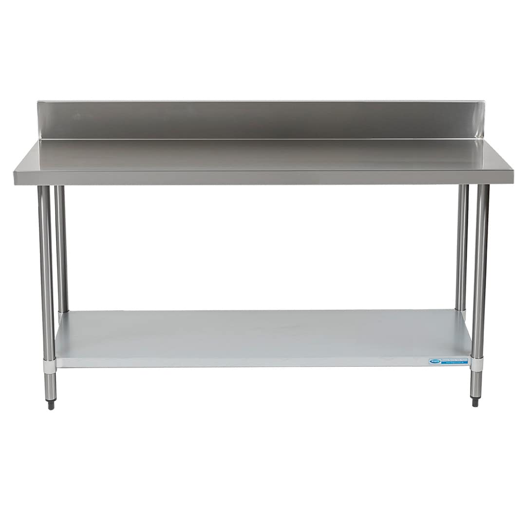 Stainless Steel Splashback Bench, 1800 x 610 x 900mm high. Food grade 304 stainless bench, with splashback, undershelf and adjustable feet.