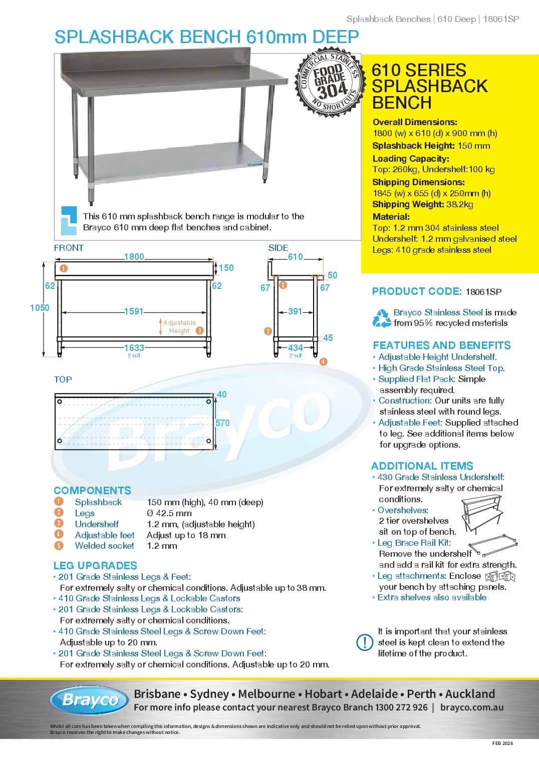 Adjustable feet screw out to give an extra 18mm height – see upgrade options for castors or screw down feet This splashback bench is modular to 610mm deep sinks and cabinets.