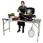 Versatile stainless steel bench with easy-fold legs and adjustable feet.