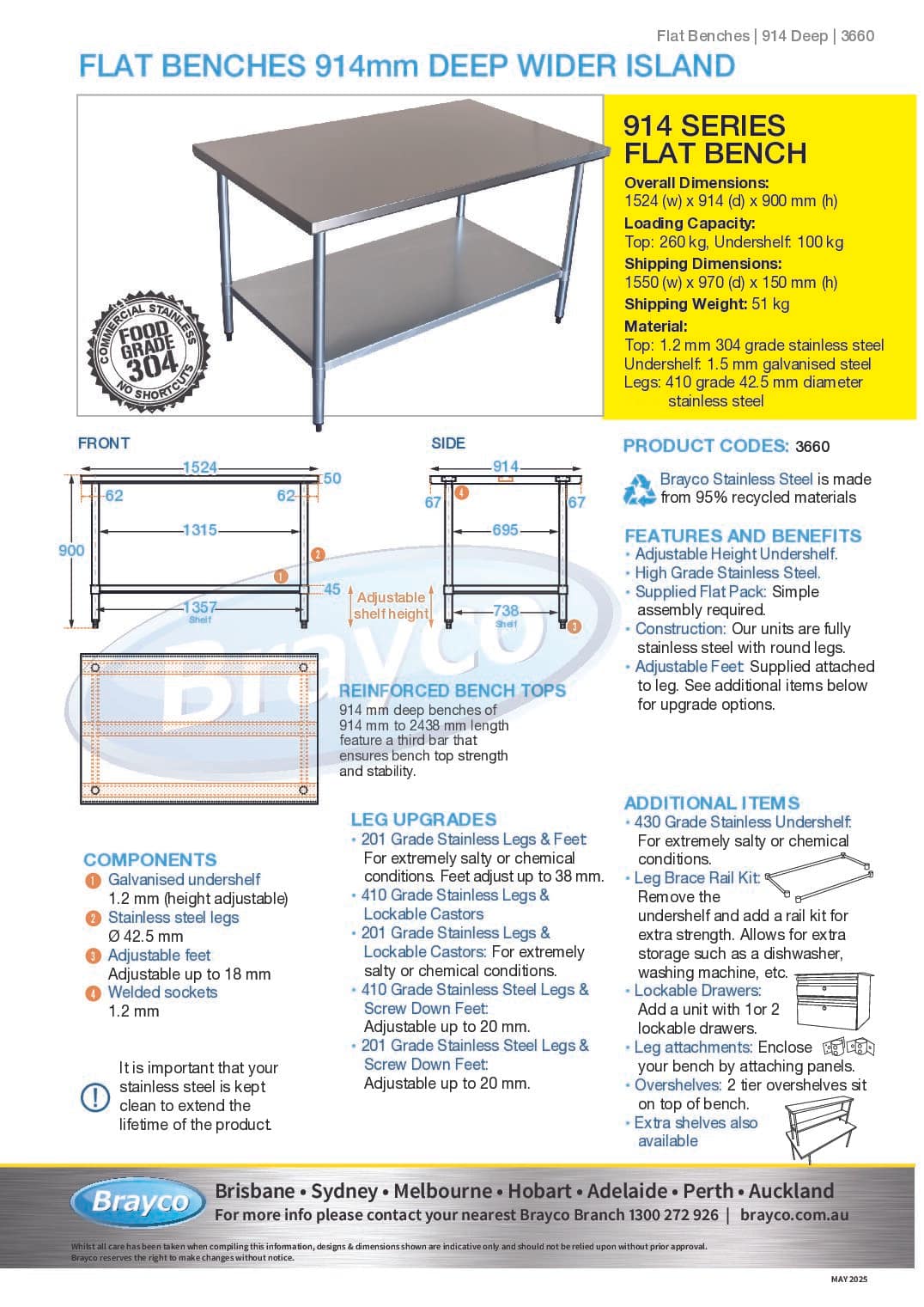 All benches are supplied with a galvanised shelf, stainless legs and height adjustable feet.