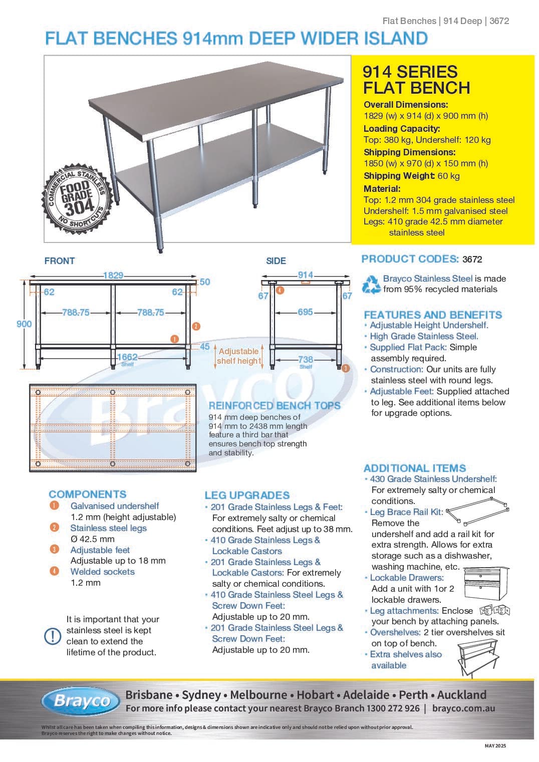 All benches are supplied with a galvanised shelf, stainless legs and height adjustable feet.