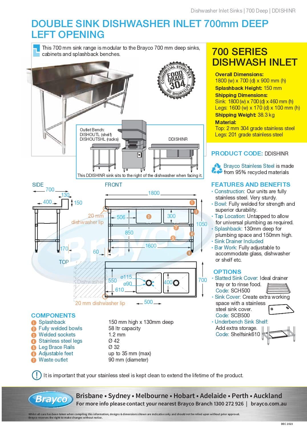 Stainless Inlet Dishwasher Sink, 1800 x 700 x 900mm high.
