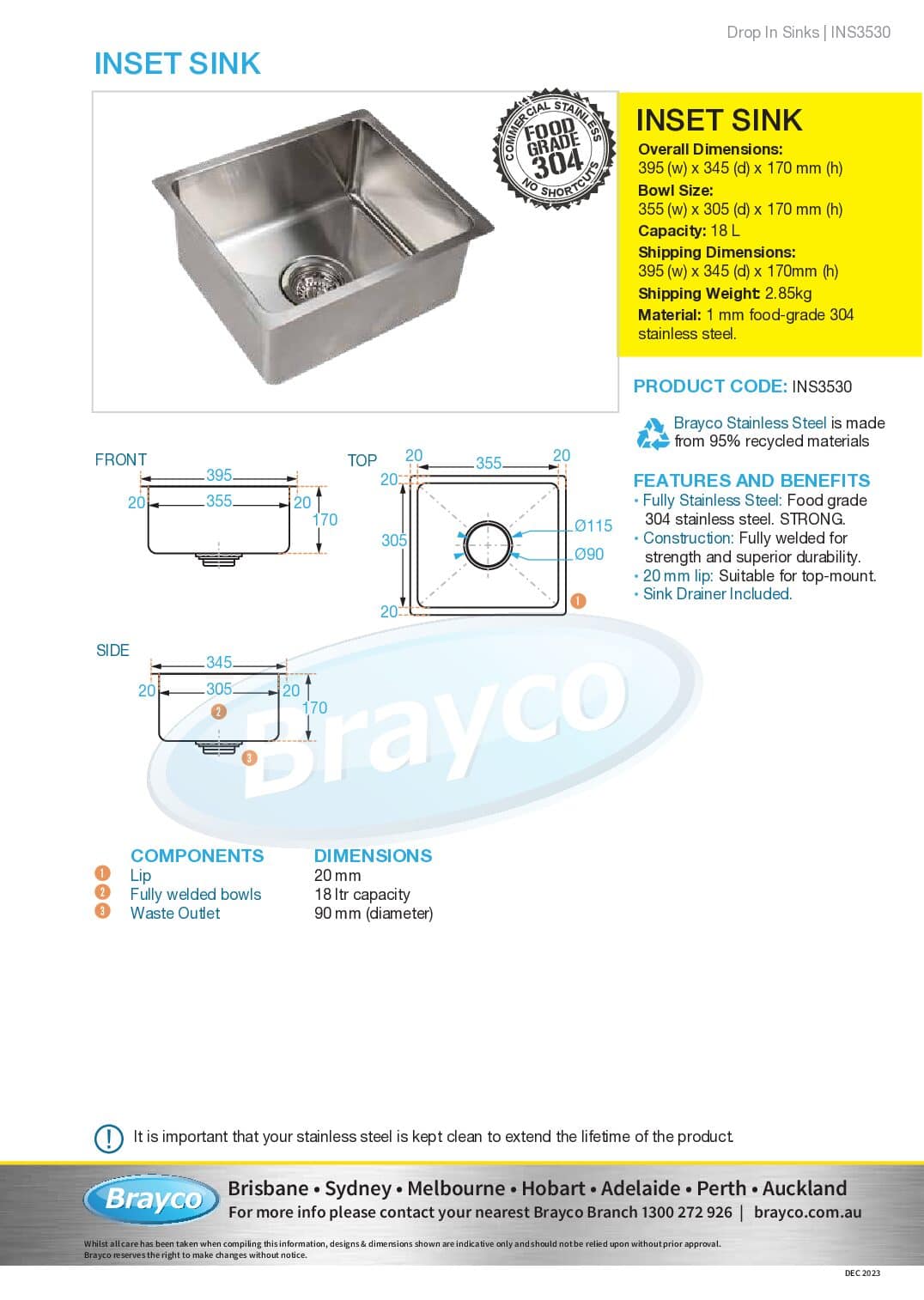 Single Inset Bowl Stainless Steel 18Lt 355 x 305mm sink