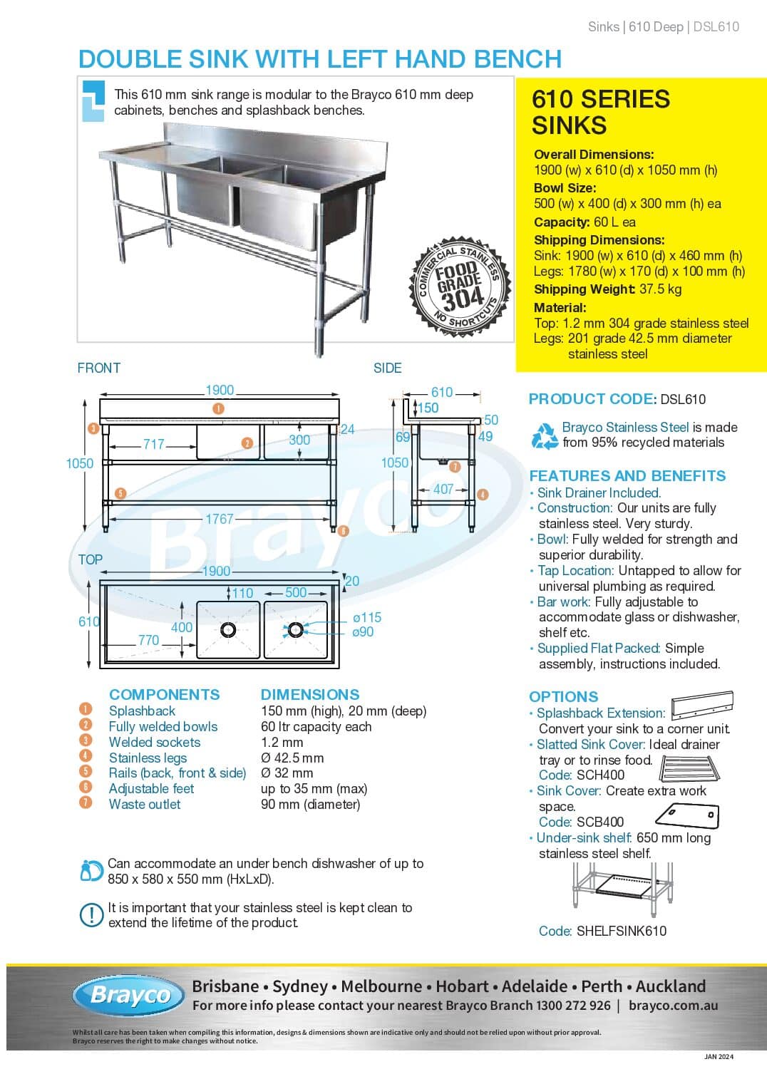 Double Bowl Stainless Sink – Left Bench, 1900 x 610 x 900mm high.