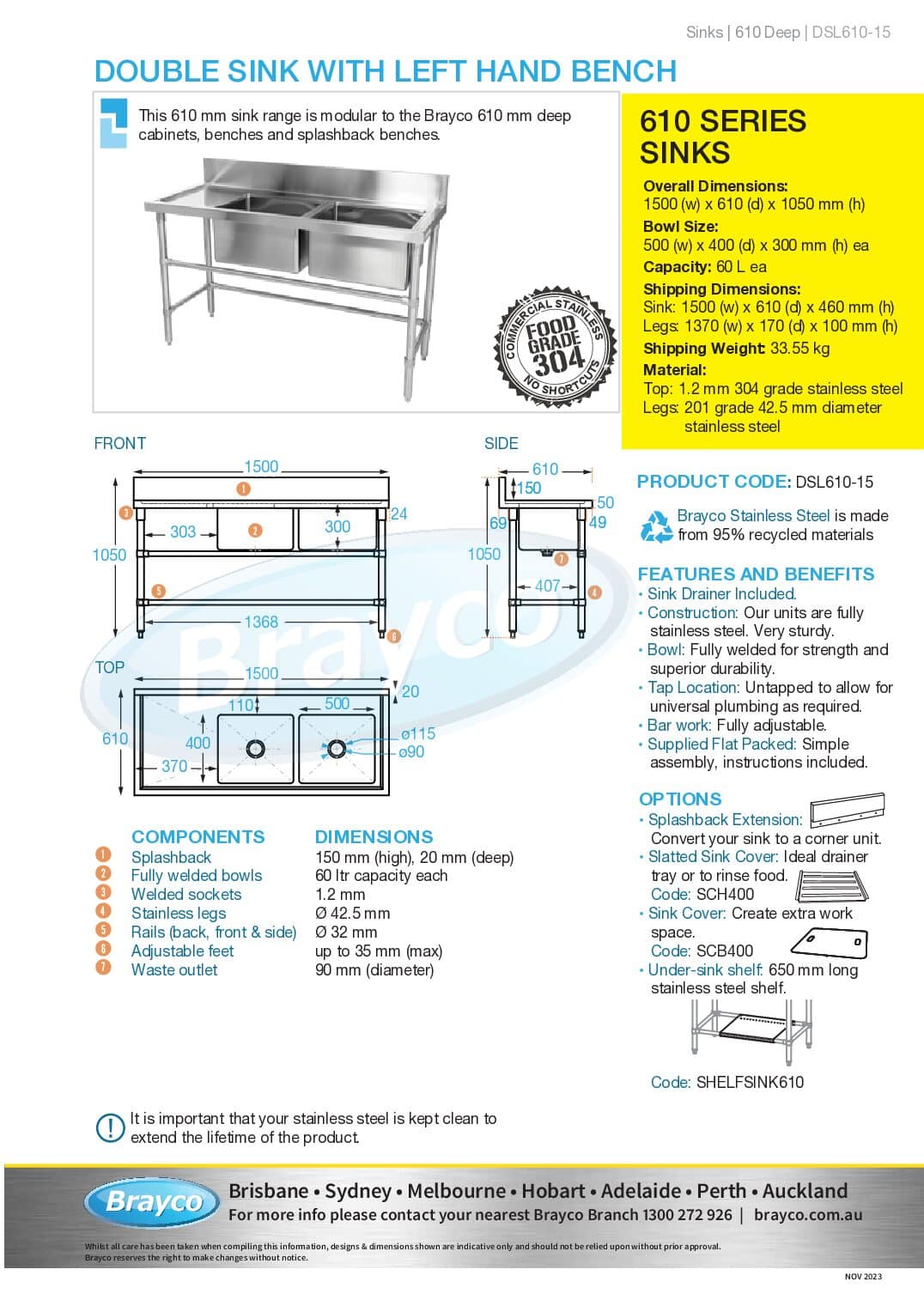 Double Bowl Stainless Steel Sink – Left Bench 1500 x 610 x 900mm high.