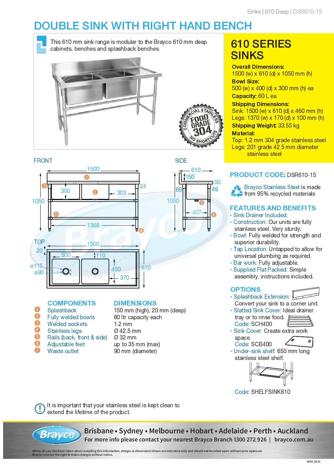 This sink matches the 610mm range of splashback benches.