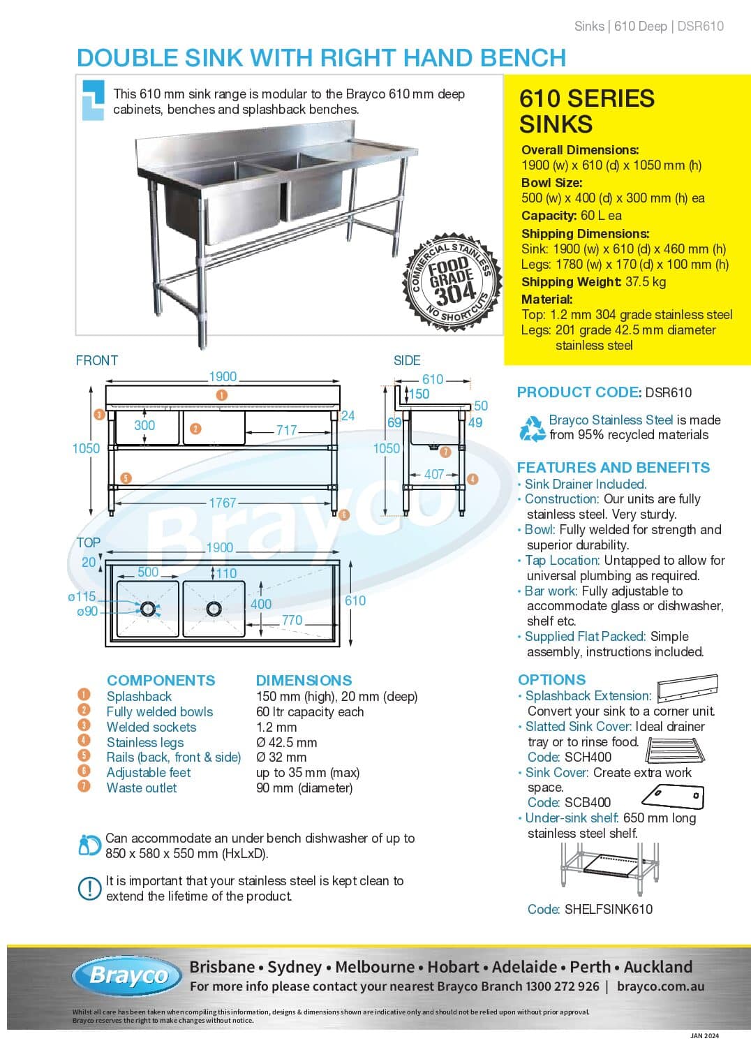 Sink: 1900 x 610 x 460mm high (including splashback)
