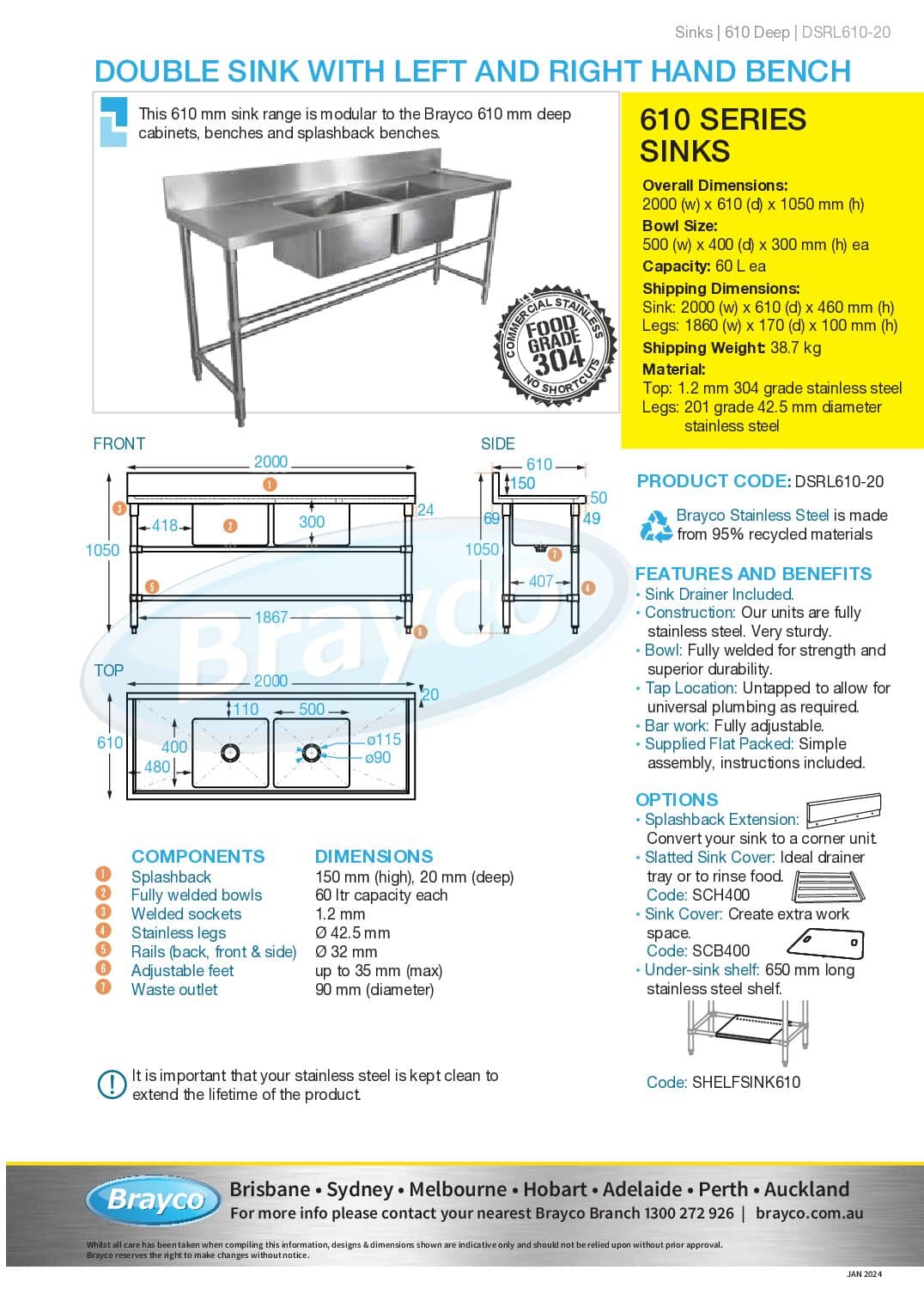Sink: 2000 x 610 x 460mm high (including splashback)