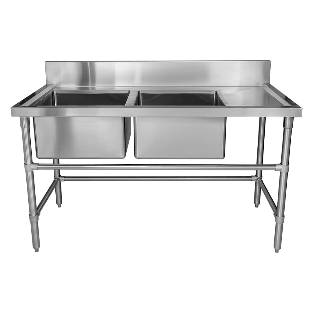Double Stainless Steel Commercial Sink – Right Bench 1500 x 700 x 900mm high. Fully stainless steel double bowl sink with splashback.