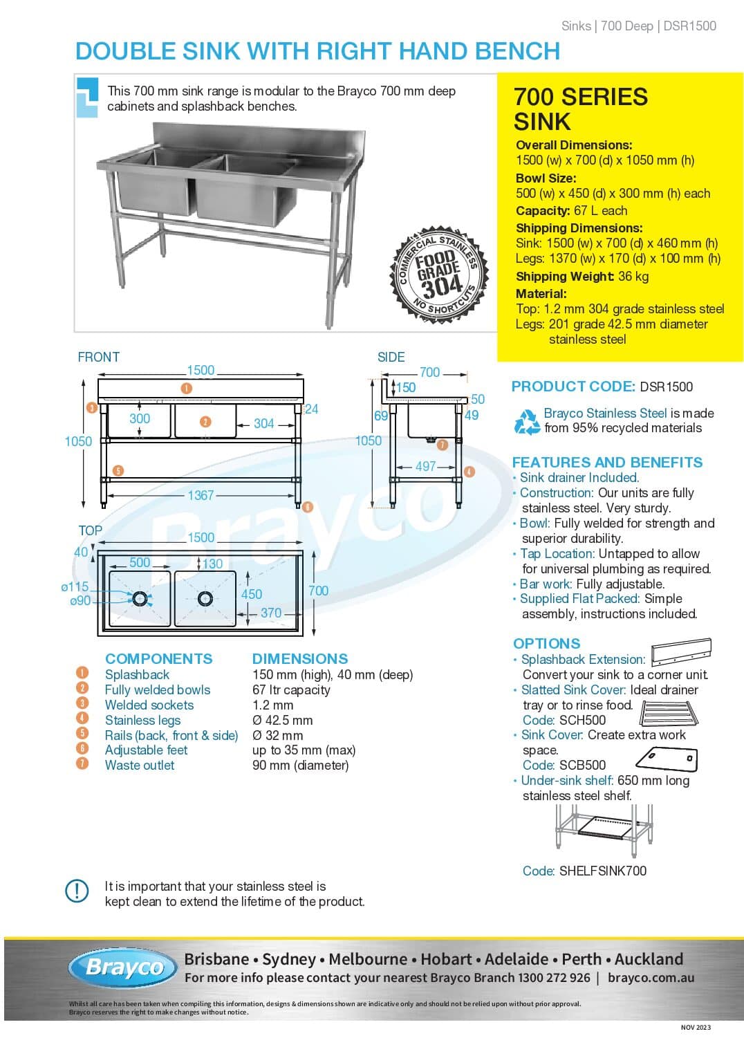 Sink: 1500 x 700 x 460mm high (including splashback)