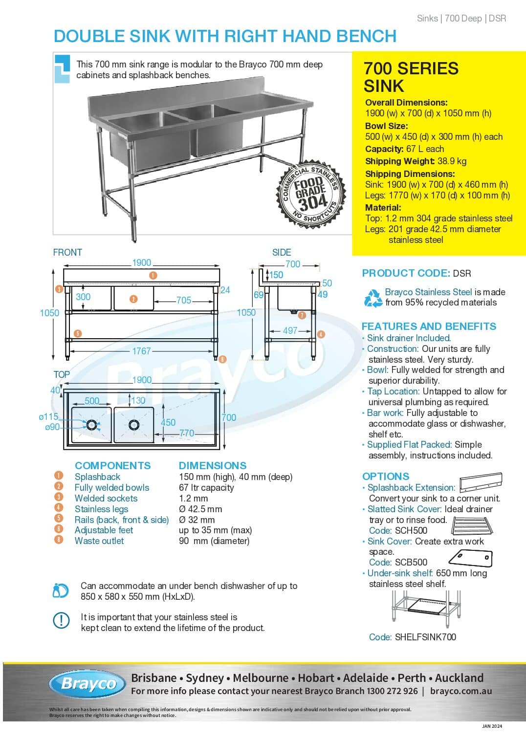 Double Bowl Stainless Steel Sink – Right Bench 1900 x 700 x 900mm high.