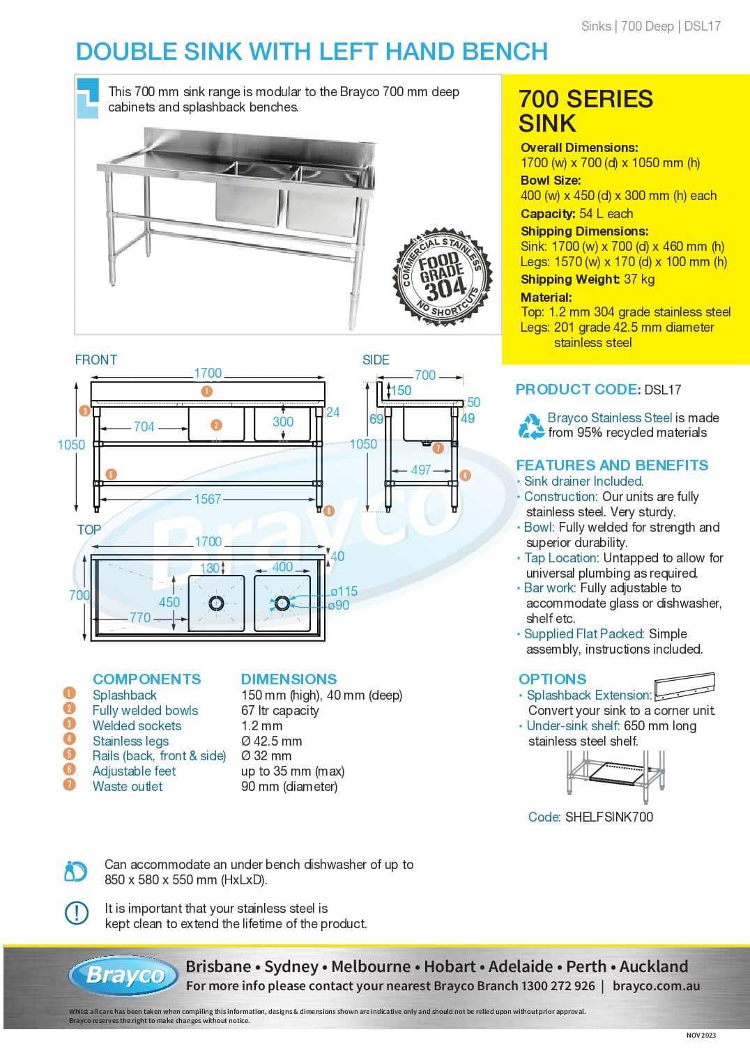 Sink: 1700 x 700 x 460mm high (including splashback)