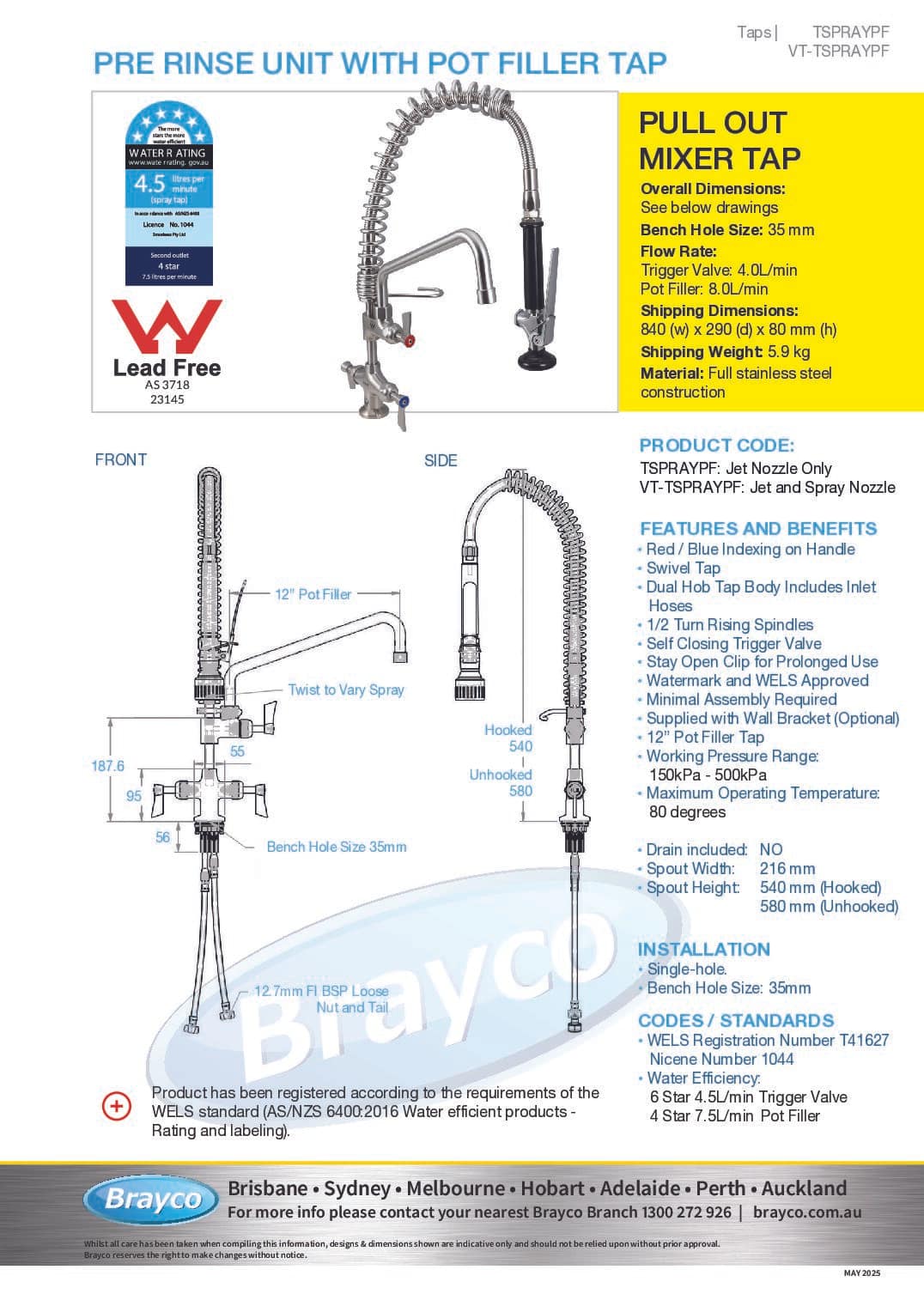 Compact pre rinse unit with overall height of 580mm. Designed for commercial applications where space is a priority.